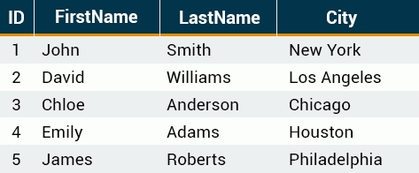 SELECT ID, FirstName, LastName, City FROM customers LIMIT 5;