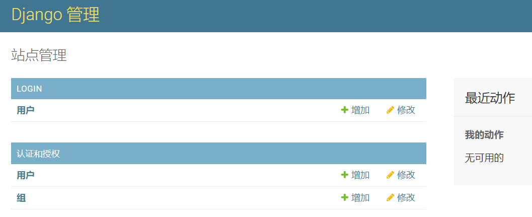 注意,图中下方的认证和授权是admin应用自身的账户管理,上面的LOGIN栏目才是我们创建的login应用所对应的User模型。