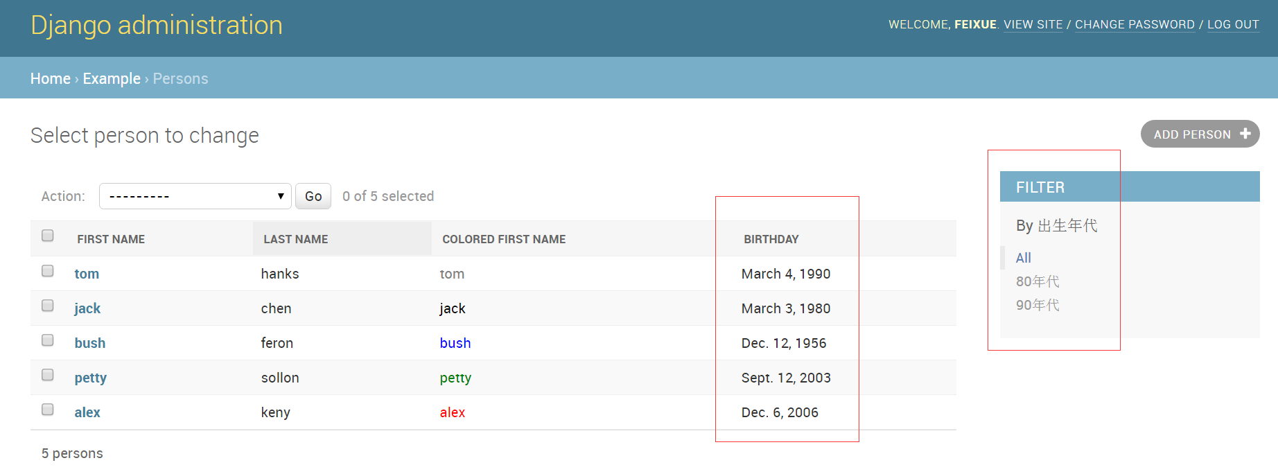 本来colored_first_name是不能排序的,给它的admin_order_field赋值first_name后,就依托first_name进行排序了。